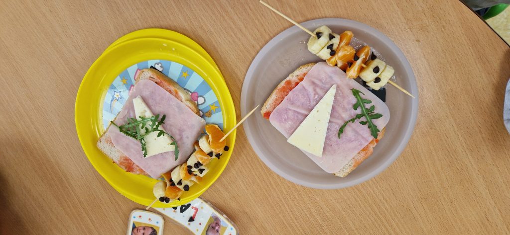 Para comenzar, han elaborado una deliciosa tostada con tomate natural, jamón de pavo, queso y brotes de rúcula y, para continuar, unas brochetas con fruta de temporada (mandarina y plátano) con pepitas de chocolate negro.