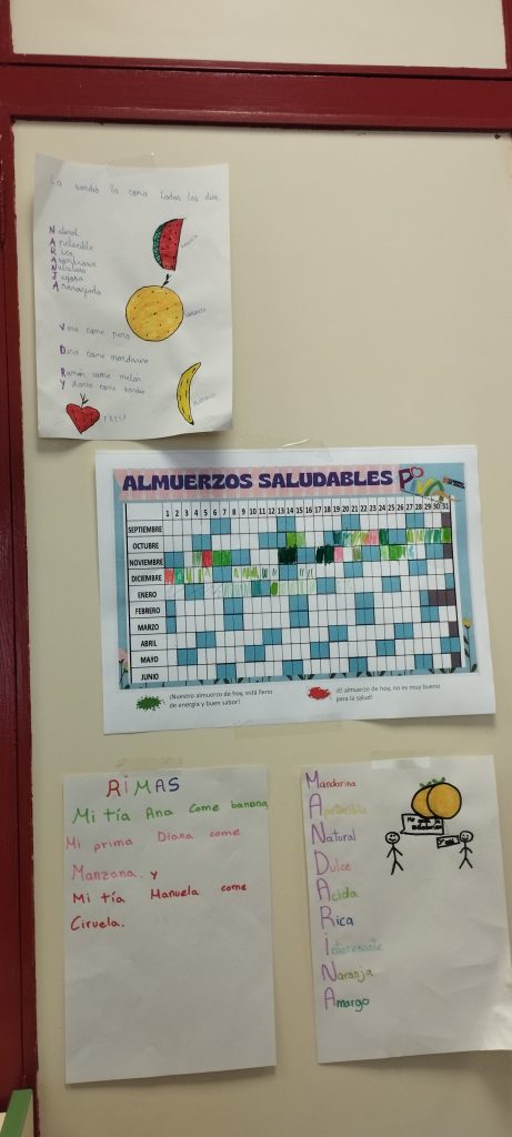 Este curso, en el CEIP Villa de Utrillas, además de seguir con el calendario de almuerzos saludables y el registro mensual de los almuerzos en las aulas de forma cooperativa, al finalizar cada uno de los trimestres han querido poner en valor y premiar a las familias y al alumnado que diariamente se preocupan de que sus hijos e hijas lleven almuerzos saludables. Este primer trimestre se han realizado unos TALLERES INTERNIVELARES DE BROCHETAS DE FRUTAS, para dar relevancia a nuestra amiga la FRUTA como almuerzo saludable. Los alumnos y alumnas mayores fueron a las aulas de los pequeños. Cada uno trajo una fruta y entre todos se cortó la fruta y se realizaron las brochetas que luego muy a gusto se comieron entre todos y todas. A los peques les encantó compartir el taller con los mayores y los mayores disfrutaron ayudando a los pequeños. Además se acompañó la jornada con adivinanzas y trabalenguas.