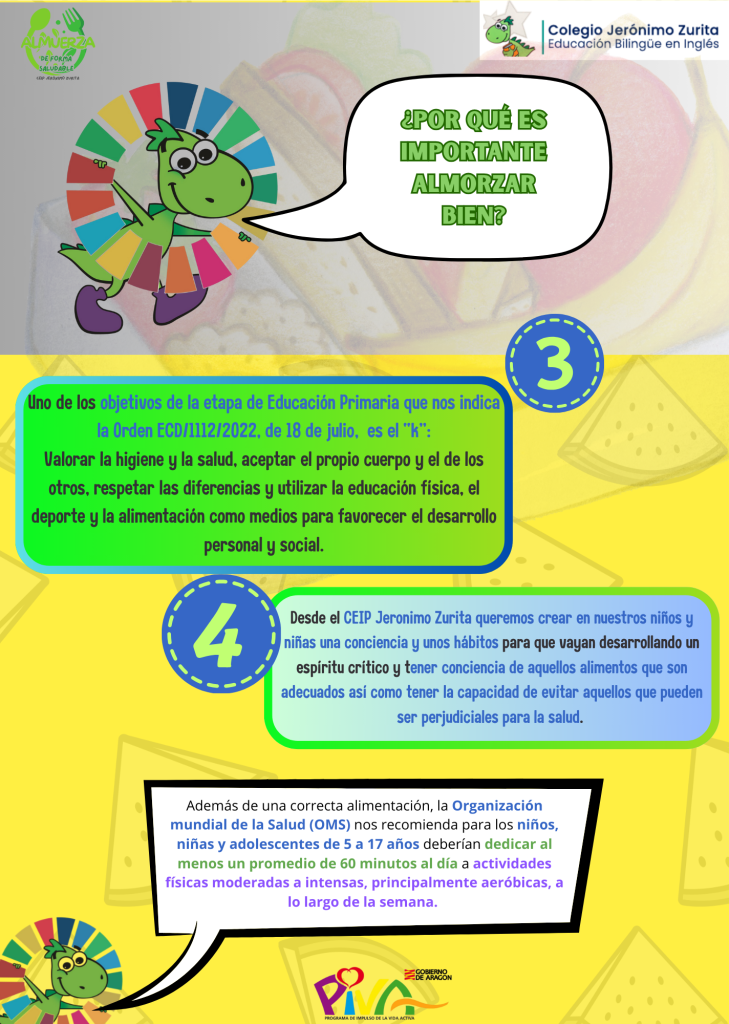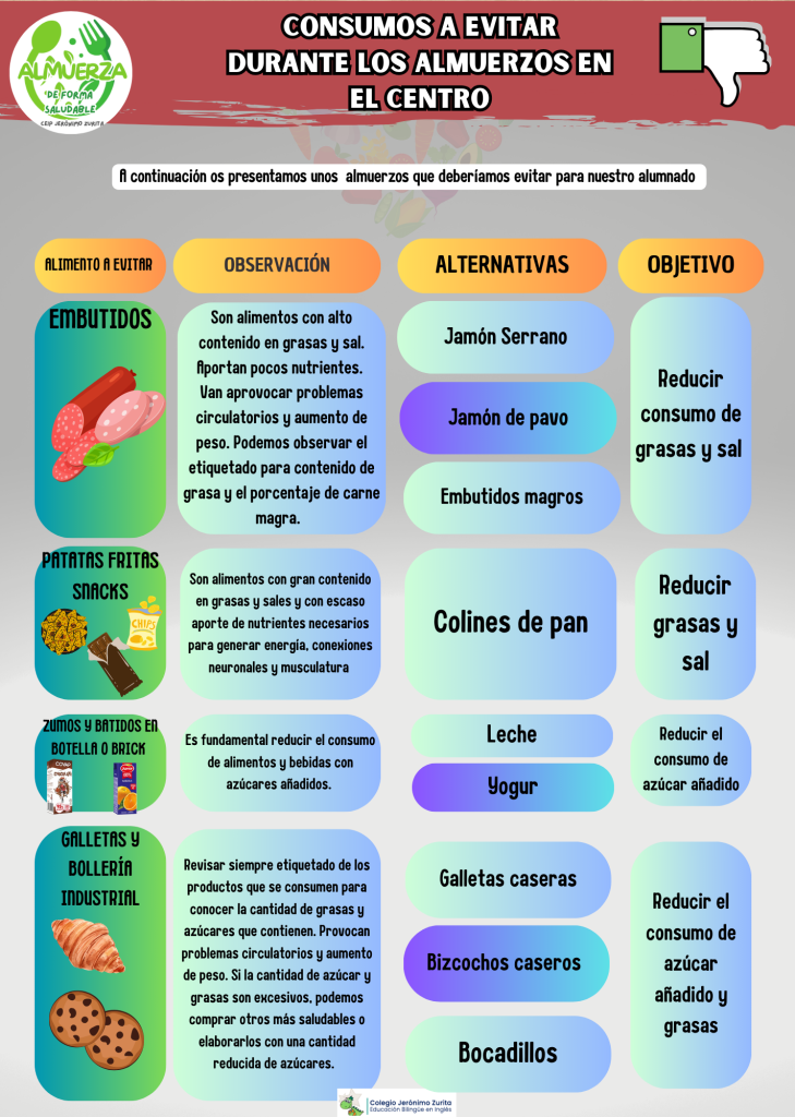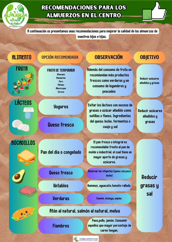Dentro de las acciones simbólicas para fomentar hábitos de vida saludables, desde el CEIP Jerónimo Zurita han compartido con las familias unas pautas sencillas para preparar almuerzos saludables, equilibrados y adecuados para los niños y niñas.