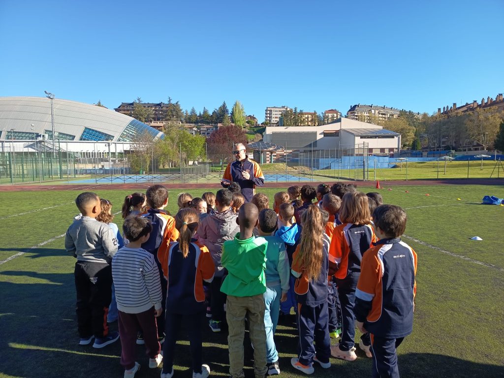 En una de esas actividades, el alumnado de Educación Primaria se ha desplazado a las pistas municipales de atletismo para celebrar el DÍA DE LA E. FÍSICA EN LA CALLE. Allí les estaban esperando sus profesores de Educación Física, Luis y Guillermo, con una propuesta de juegos y actividades que han hecho de la jornada una experiencia diferente y muy especial fuera del entorno escolar.